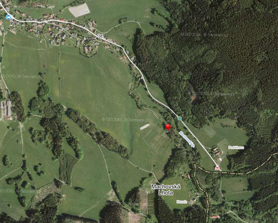 (červený špendlík zobrazuje polohu srubu na mapě ČR, resp. na leteckém snímku Machovské Lhoty)